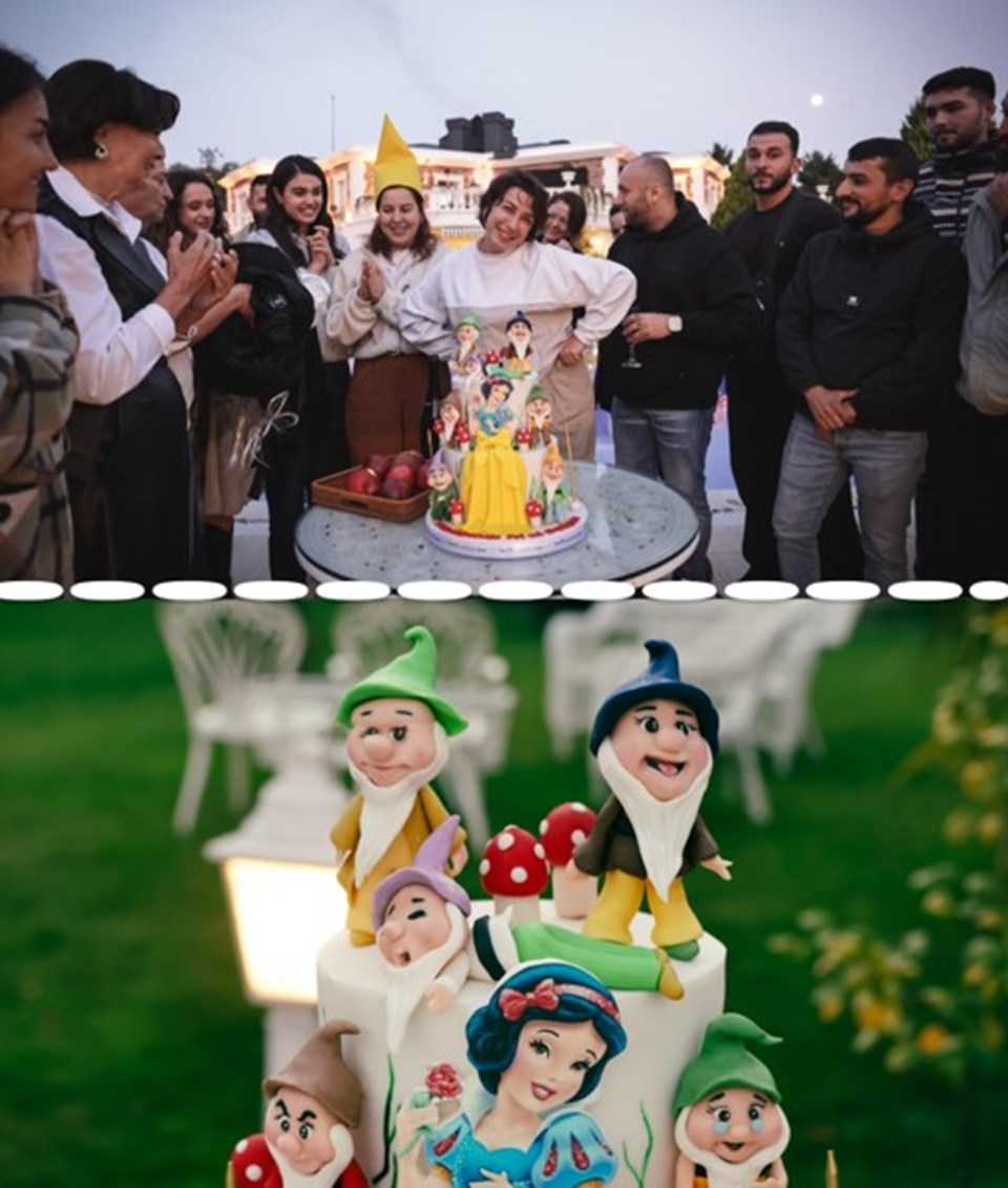 Alptekin, doğum günü için hazırlanan “Pamuk Prenses ve Yedi Cüceler” temalı pastası ve çalışma arkadaşlarıyla poz verdi.